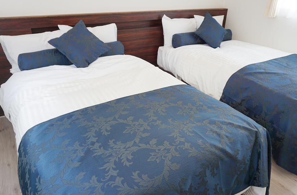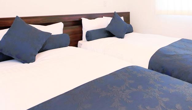 寝室は二人用と四人用(二段ベット)を用意しております。ベットはセミダブルサイズが4台、2段ベットの上段2台がシングルサイズとなります。